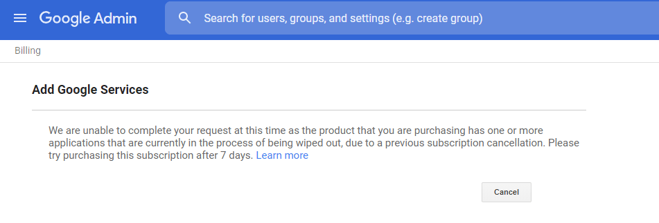 If you want to resubscribe to G Suite—You can add a new G Suite subscription to your existing account within 21 days of cancelling. Otherwise, you’ll need to wait until after 84 days when the cancellation process finishes.