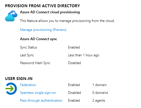 - Navigate to Azure to verify current status of Pass-through Authentication Enabled.
