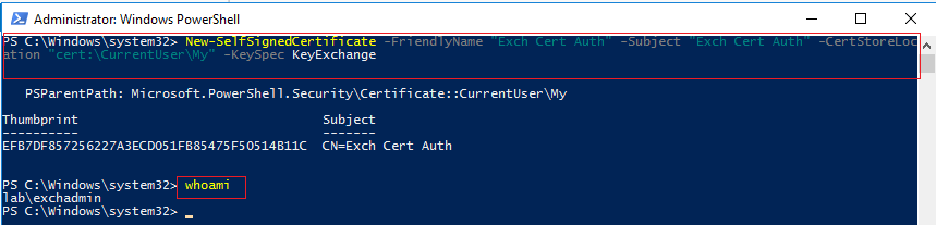 New-SelfSignedCertificate -FriendlyName "Exch Cert Auth" -Subject "Exch Cert Auth" -CertStoreLocation "cert:\CurrentUser\My" -KeySpec KeyExchange