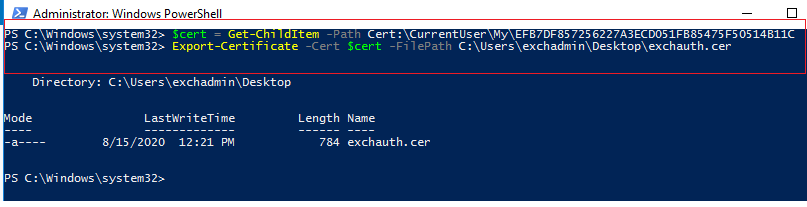 Export-Certificate -Cert $cert -FilePath C:\Users\exchadmin\Desktop\exchauth.cer