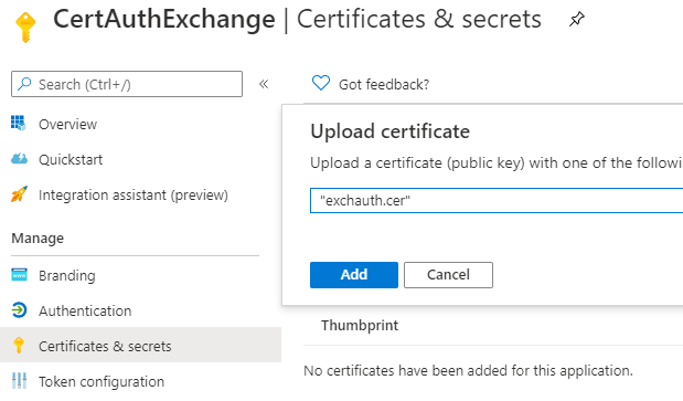- Navigate to “Certificates & Secrets” and upload the certificate.