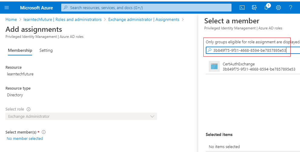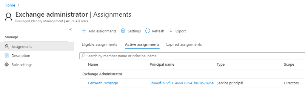 - Navigate to Roles and Administrators > Search for Exchange Administrator > Click on Add Assignments.