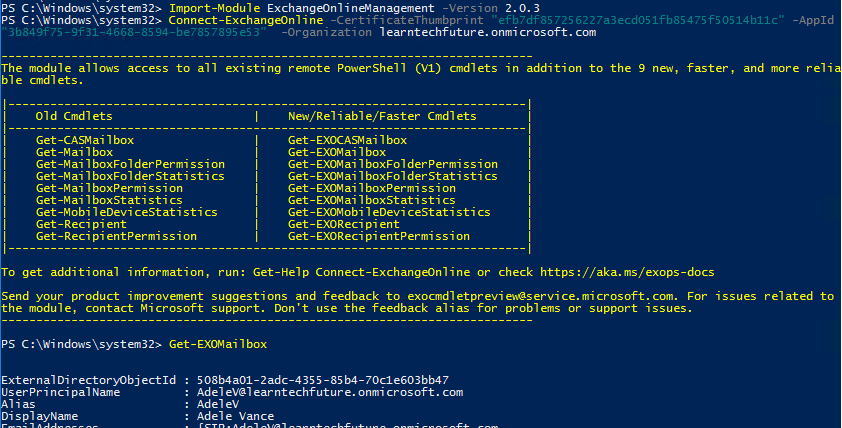 $session = Connect-ExchangeOnline -CertificateThumbprint "efb7df857256227a3ecd051fb85475f50514b11c" -AppId "3b849f75-9f31-4668-8594-be7857895e53" -ShowBanner:$false -Organization learntechfuture.onmicrosoft.com