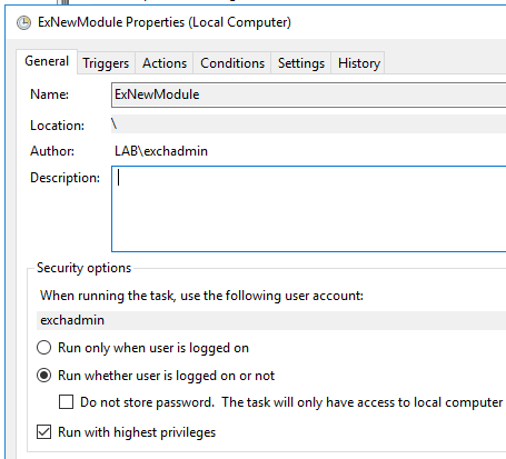 Note : Create self signed cert with the account, which will be used to run task scheduler job. In my case I will be creating cert via exchadmin@lab.local
