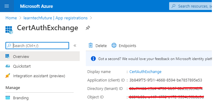 - Now, you will see App has been created and some useful info appears like App ID, Object ID etc.