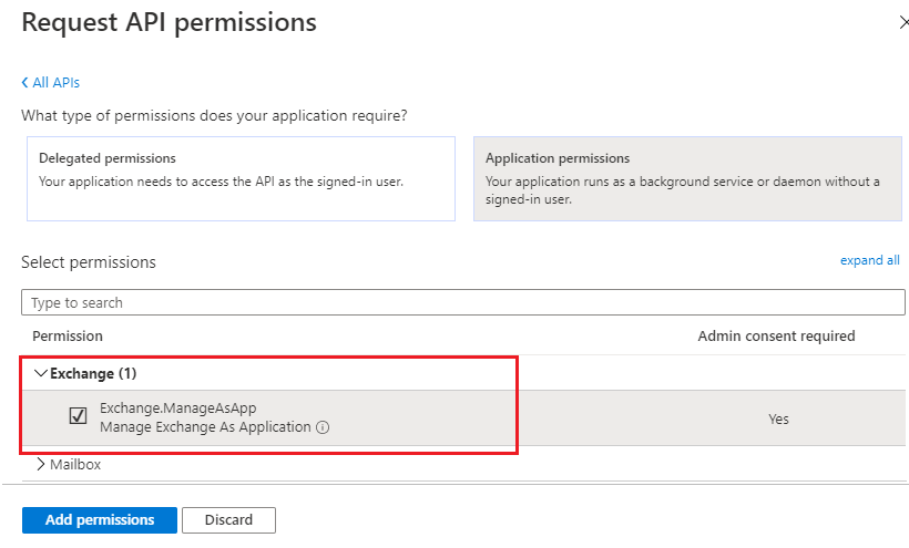 - Create an application in Azure AD with Exchange.AsManageApp permission.
