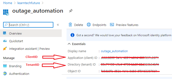 - You will need Client ID, Tenant ID and Client Secret as shown below for the script on respective options :