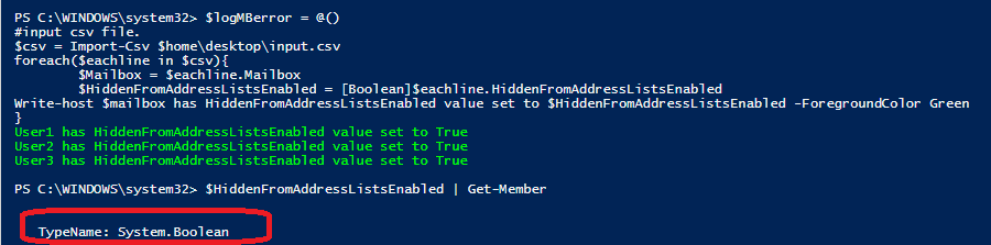 - I had to set HiddenFromAddressListsEnabled property of all mailboxes to $true or $false based on the input from a csv file.
