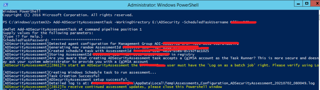 Add-ADAssessmentTask -WorkingDirectory E:\AD -ScheduledTaskUsername ServiceAccountName