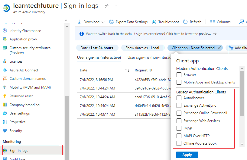 - Login to Azure (portal.azure.com), then navigate Azure Active Directory, Sign-in Logs and filter logs with “Client App” and choose the individual protocols under “Legacy Authentication Clients” section.