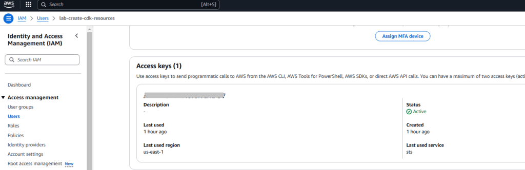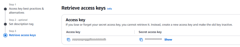 - Navigate to IAM > Users and create a new user or update existing and get the Access keys.